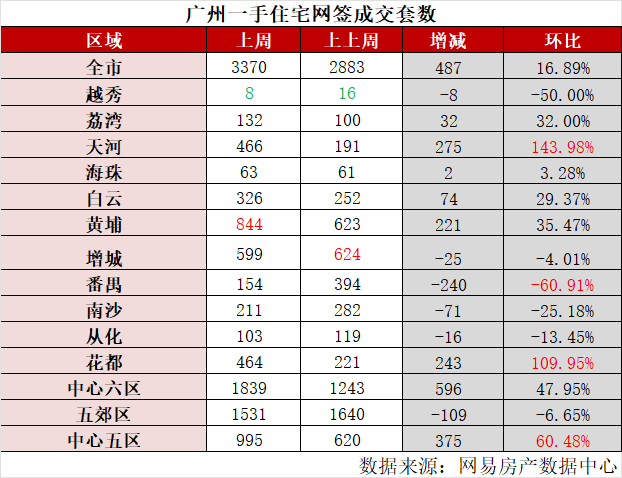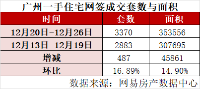 来自网易房产数据中心监控阳光家缘数据显示,上周(12月20日-12月26日)广州一手楼网签成交3370套,环比上升16.89%;面积方面,上周广州一手住宅网签面积为353556平方米,环比上升14.9%。