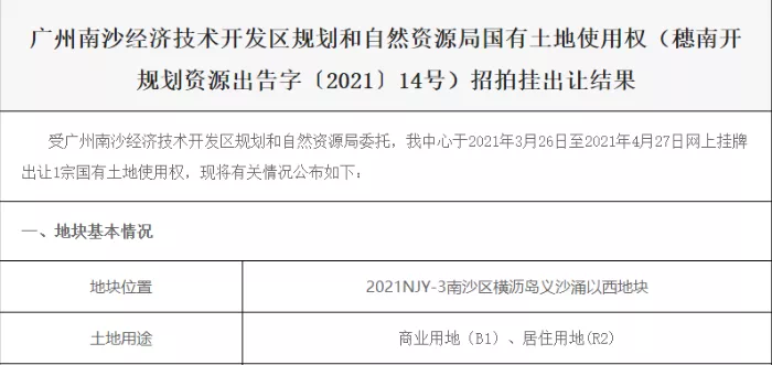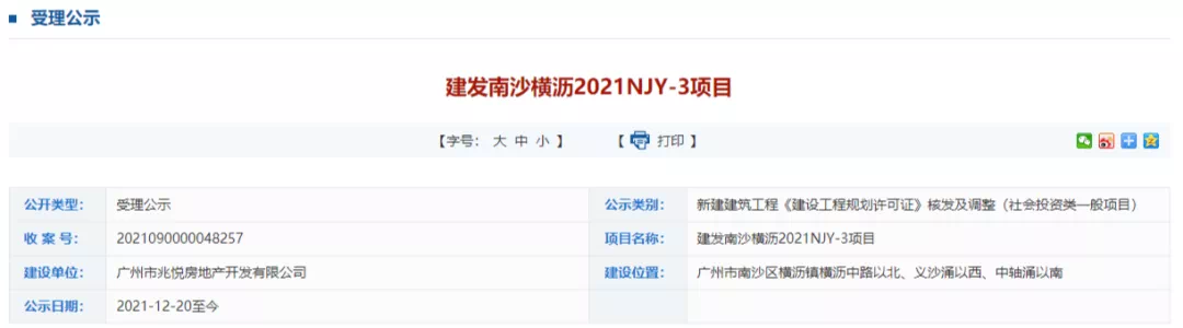 此外,截至12月20日,广州规划与自然资源局也发布了建发南沙横沥2021NJY-3项目进入受理公示阶段的公告。