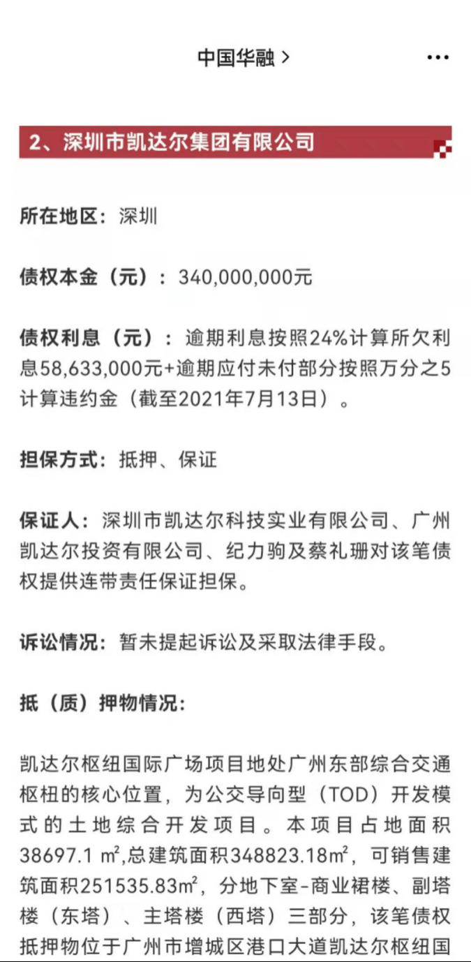 而中国融华在一个月前公布的信息又显示,凯达尔枢纽国际广场部分在建项目通过抵押的方式,借款3.4亿元。截至2021年7月13日,该笔债务已经产生逾期利息5863.3万元。