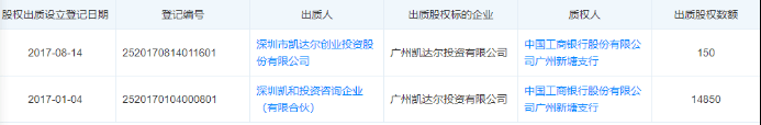 南都记者在天眼查上看到,2017年,凯达尔在中国工商银行广州新塘支行办理过两次股权质押。