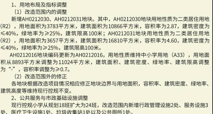根据控规显示,拟扩大中小学用地规划范围,将用地面积从8893㎡扩大至11024㎡,容积率调整为≥0.7。