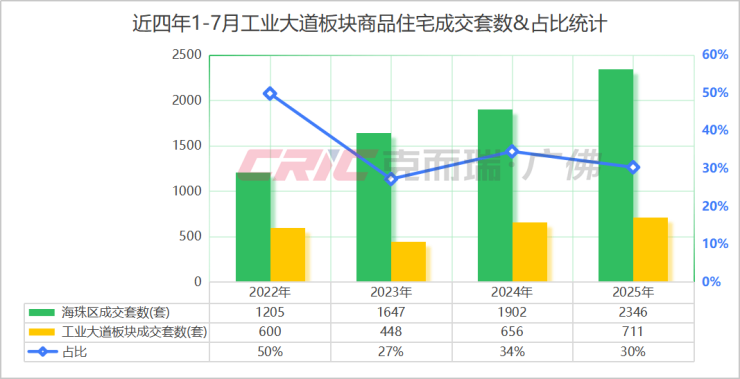 其中工业大道板块除2023年外,在另外三年均为海珠区的主力成交,今年1-7月工业大道板块成交711套,占比30%。