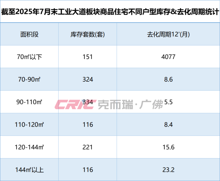 库存结构中,克而瑞数据监测显示,今年1-7月工业大道板块90-110㎡户型库存规模最高,共有334套,去化周期5.5个月。