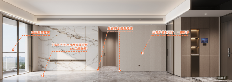 地面采用的750X1500MM大规格仿石地砖,相比市场主流的650*650MM规格,同等面积减少一半以上拼接缝隙,既美观大方,也更易于清洁。