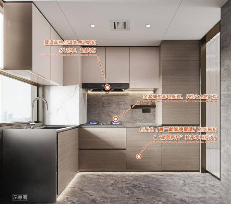 独立的私密入户花园可以灵活改造,例如用作储物空间,放置外出的婴儿车或折叠单车;L型厨房设计的线条干净,且空间利用相对较优,洗菜做饭“两不误”。