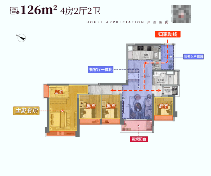 以建面约126平大四房户型为例,5开间厅卧朝南设计,所有卧室都能享受全景大飘窗,实现约16米面宽采光。