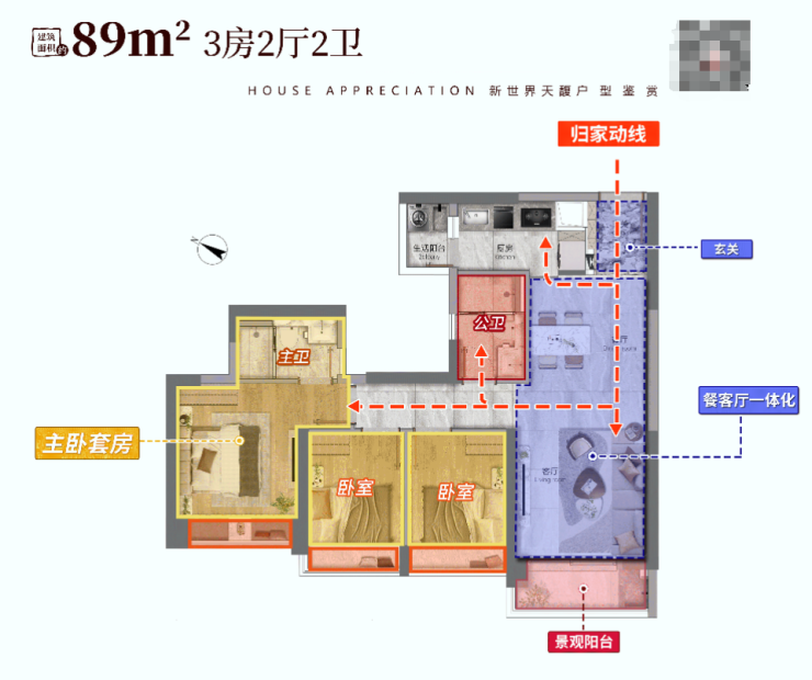 例如在89平户型中,进门四五步即直达客厅,转身通过廊道即见主卧和次卧;而在126平户型中,从入户花园到主卧次卧的整条归家动线,全程下来也只需三次“半转身”即可。
