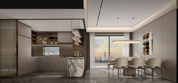 LDK餐客厨一体设计,融合在整个生活动线中,既能打破传统常规的空间区隔,深化家人之间的互动交流,又能化繁为简,使室内环境更为通透明亮。