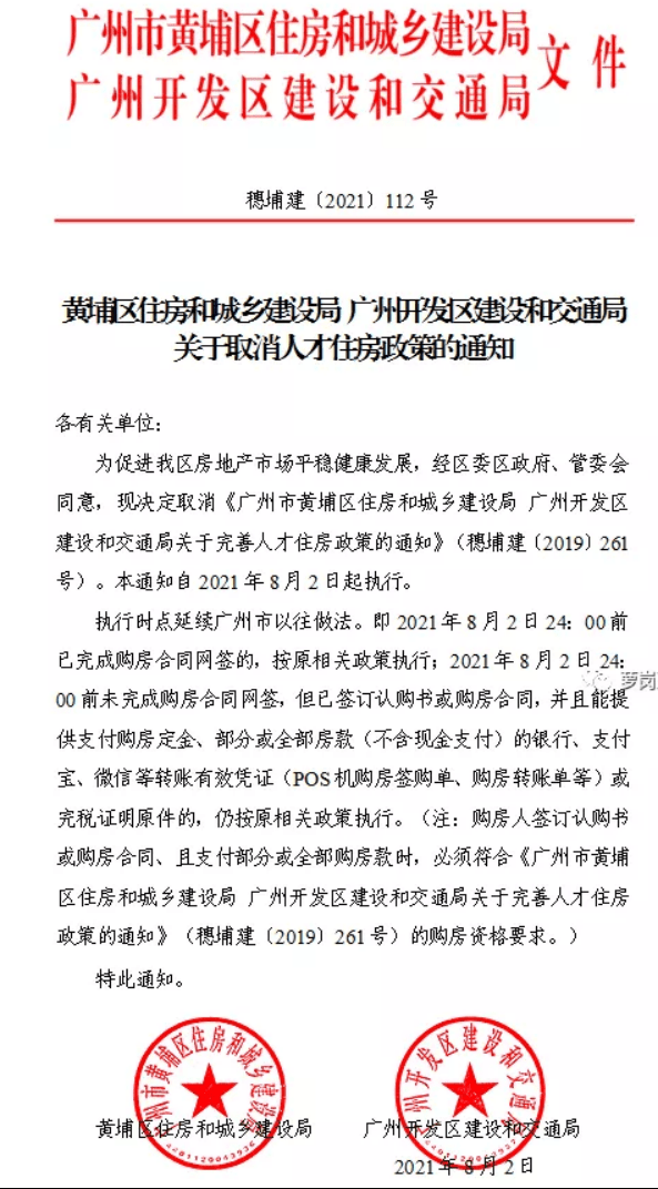 8月2日,黄埔区住房和城乡建设局,广州开发区建设和交通局联合发布关于取消人才住房政策的通知。通知于8月2日起执行。