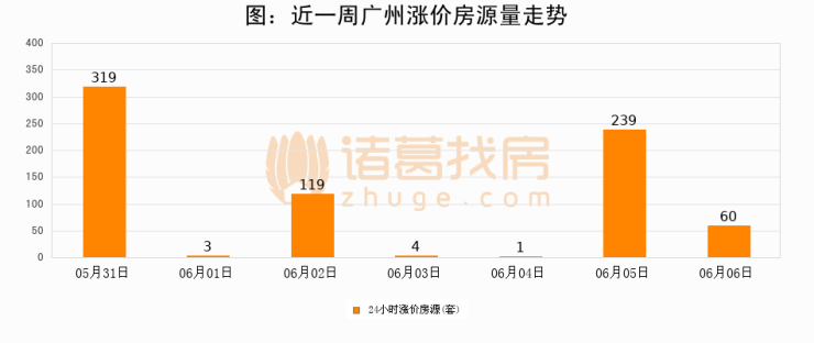 根据诸葛找房数据显示,广州24小时涨价房源量为60套,较06月05日减少179套,环比下降74.9%。与此同时,涨价房源占比小幅回落,对于购房者来说是一个入市窗口期,购房者可抓住时机入市。