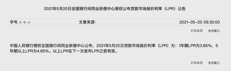 中国人民银行授权全国银行间同业拆借中心公布,2021年5月20日贷款市场报价利率(LPR)为:1年期LPR为3.85%,5年期以上LPR为4.65% ,两个期限品种报价均与上个月持平。