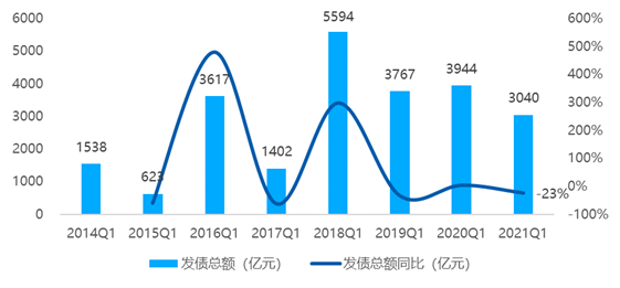 2014年Q1至2021年Q1房企债券融资规模 数据来源:Wind,贝壳研究院整理