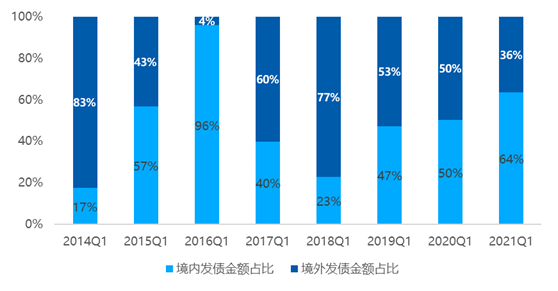 整体债市下行,境内外表现也出现分化。一季度境内债券规模占比64%,较2020年同期上升14个百分点。2021年开年以来,境内货币政策稳定中性,资金面平稳,境内债市发行规模占比近5年内首次反超境外发行规模,并有进一步扩大占比趋势。境外债方面,一季度受到通胀预期影响,美元债剧烈波动,致境外发债规模大幅下降,预期二季度境外债仍呈不确定预期。