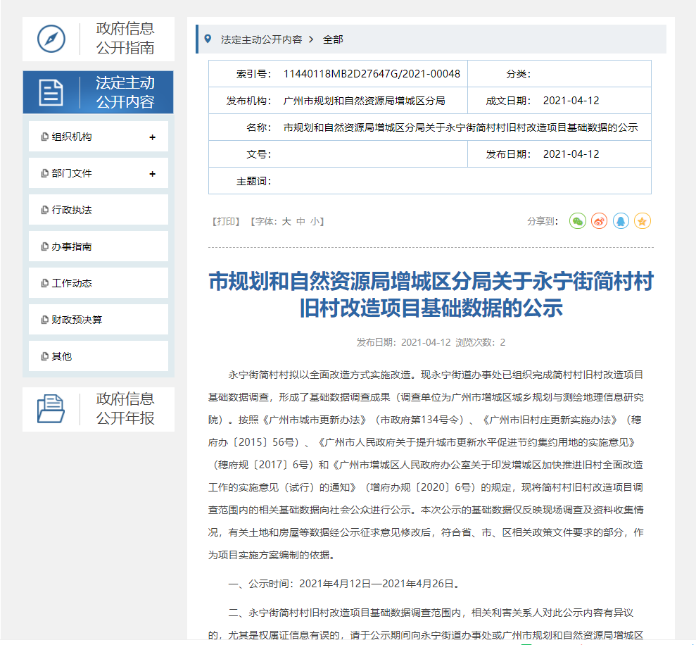 4月12日,广州市规划和自然资源局增城区分局公示了关于永宁街简村村旧村改造项目基础数据。