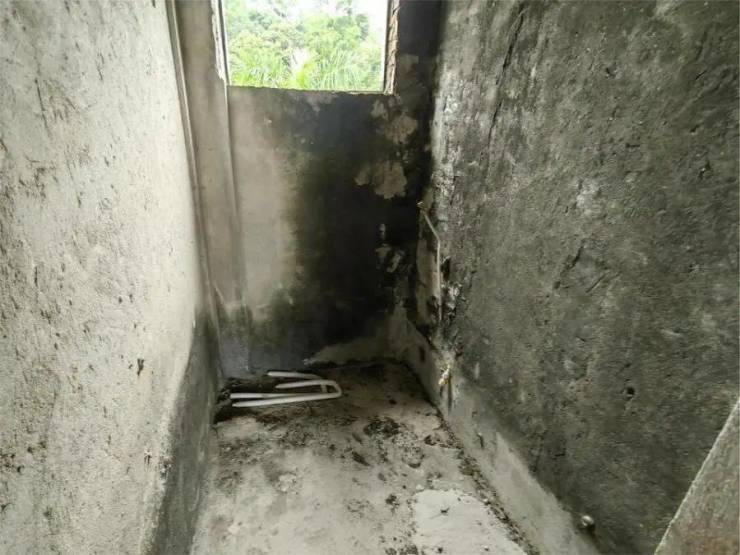 并且,由于房屋长期裸露,未刷墙漆封闭保养,使得水汽渗透进墙体,导致产生大面积绿色霉变。