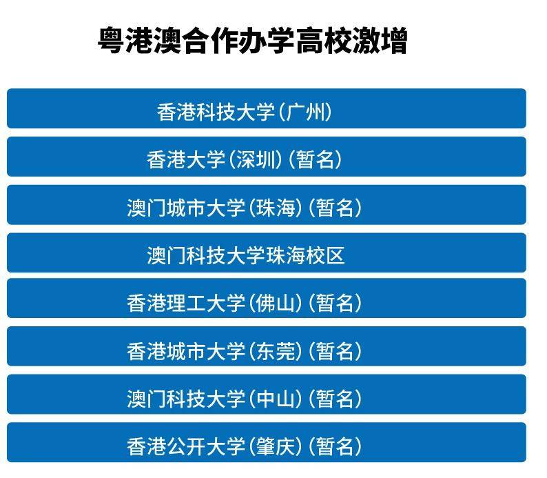 比如去年,香港城市大学(东莞)、澳门科技大学珠海校区、香港公开大学(肇庆)建设均有了新进展,地方政府与港澳高校签署合作办学协议;香山大学(由中山市人民政府与澳门科技大学合作办学)筹办工作已列入中山市政府工作报告,佛山市教育局也持续推进香港理工大学(佛山)筹备工作。