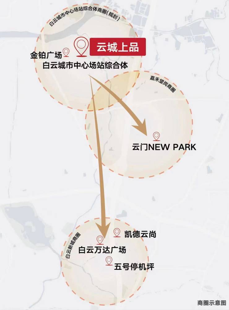 云城上品,位于双高速轨道(在建)换乘站——白云城市中心站(在建)上盖,该站四线交汇:广花城际(与地铁18号线连接、在建)芳白城际(与22号线连接,在建)、34号线(规划)、39号线(规划)。