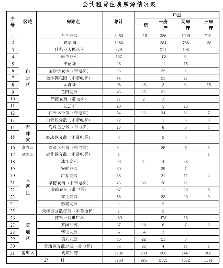 据了解,本次推出分配的公共租赁住房房源点共有31个,总套数为8763套。主要分布在白云区,共有5620套,其中石丰花园数量最多,为3450套。其次是番禺区,2102套房均集中在城隽和府房源点,黄埔区有667套,天河区有315套,荔湾区有34套,海珠区有24套,越秀区仅1套。最终供应房源套数将根据申请对象意向登记情况调整。