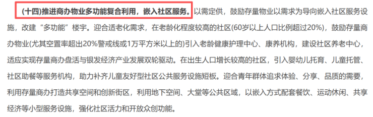 例如,推进商办物业多功能复合利用,以需定供,鼓励存量物业以需求为导向,打造嵌入社区服务设施,引入餐饮、运动休闲等基础配套,改建“多功能”楼宇。