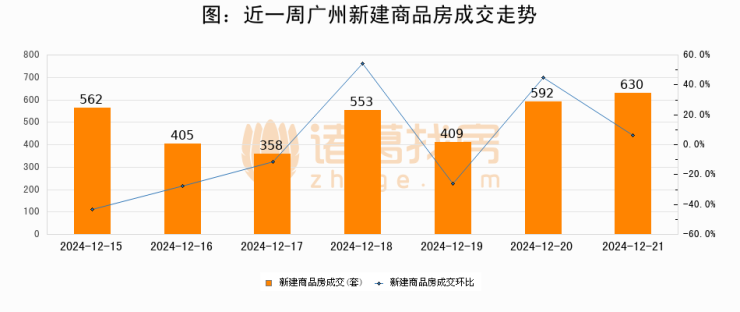 根据广州市住房和城乡建设局数据显示,2024年12月21日广州新建商品房成交630套,较昨日增加38套,环比上涨6.4%