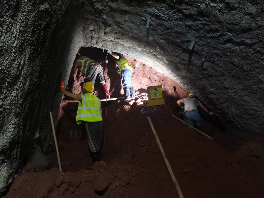 面对复杂的地质环境和紧张的工期压力,广州地铁和施工单位中铁五局的地铁建设者们组建了经验丰富的隧道暗挖项目管理团队,认真细致地摸查施工现场的复杂情况,不断优化施工方案,通过落实超前地质预报工作,严抓超前支护质量、严控拱顶帷幕注浆质量,并额外进行上导洞全断面注浆,进一步确保隧道施工的安全。同时,地铁建设者们还根据围岩情况的变化,创新调整开挖工艺和设备选型。针对上软下硬地层,将挖机改装为短臂掘进,配套铣挖头开挖上导洞,用掘进机开挖下导洞,极大地提高了隧道成洞工效。结合暗挖隧道各工序循环作业衔接时间和防控风险,建设者们编制各工序卡控时间表,明确作业人员数量,增加协作队伍作业人员数量,极大地提高了各工序效率,提前顺利完成了导洞贯通的节点目标。