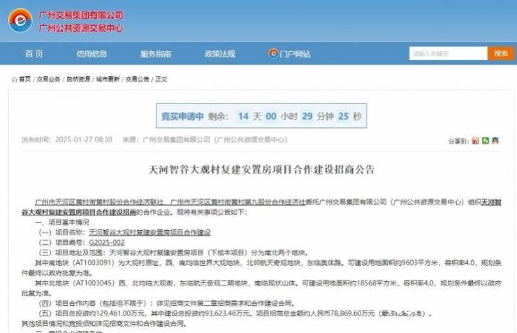 位于天河智慧城的城中村改造刷新进度条。近日,广州公共资源交易中心发布广州天河智谷大观村复建安置房项目合作建设招商公告。
