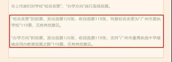 广州名校办民校更名工作继续有新进展。随着广雅系、广附系、二中系、广外系部分学校相继更名后,执信系一民校也开始启动相关工作。24日,星河湾番禺执信中学公众号发布消息称,学校成功地召开2021年广州市番禺执信中学(附属小学)教职工代表大会。会上代表们对学校“校名变更”、“办学方向”进行现场投票。最终同意学校校名变更为“广州市星执学校”,并支持“广州市番禺执信中学继续走民办教育发展之路”。