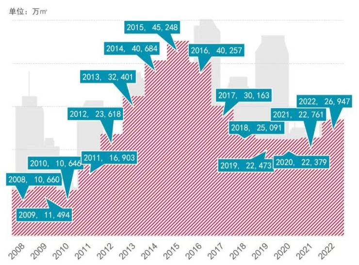 不过,目前的库存量并非历史最高值。戴德梁行数据显示,自2008年以来,有5个年份的全国新建商品待售面积高于2022年。其中,2014、2016年的待售面积均超过4亿平方米,待售面积远高于2022年。