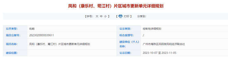 10月7日,凤和(康乐村、鹭江村)片区城市更新单元详细规划(下简称“规划”)进行批前公示。