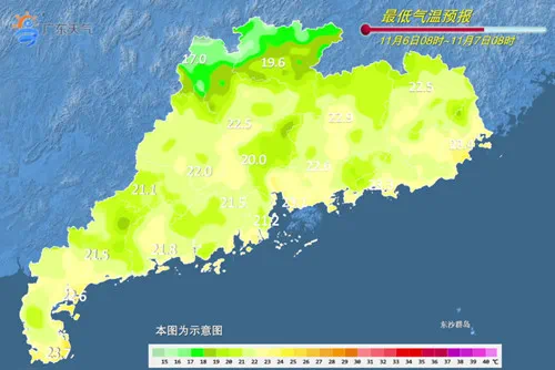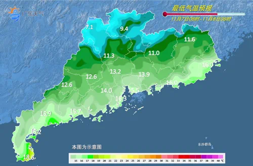 而到8日,粤北、粤东和珠江三角洲的北部市县分散小雨转多云到阴天,其余市县阴天转多云到局部有小雨。较低气温:粤北市县7~11℃,其中高寒山区3~6℃;南部沿海市县15~18℃,其余大部市县12~15℃。