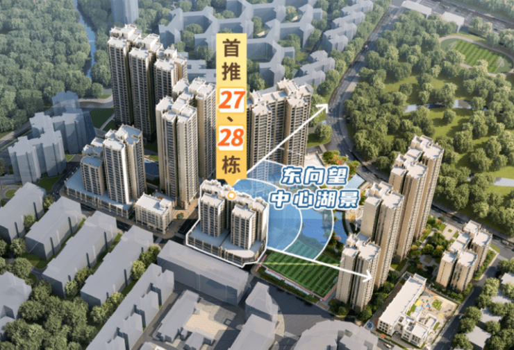 本次首推位于新组团的中部的27、28栋,东面俯瞰中心湖景,西面则望小区园林,景观资源占优,首推产品为建面约96-107㎡三房至四房。