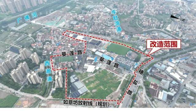 葵蓬村村镇工业集聚区属于广州市第三批村镇工业集聚区更新改造试点项目,试点项目范围14.09公顷。项目位于葵蓬村中部,地处广佛交界地区,紧邻“白鹅潭商务区+海龙围科创区”两大重点平台。项目东邻花地河,西接佛山南海区东部新城,北至连通广佛的穗盐路。