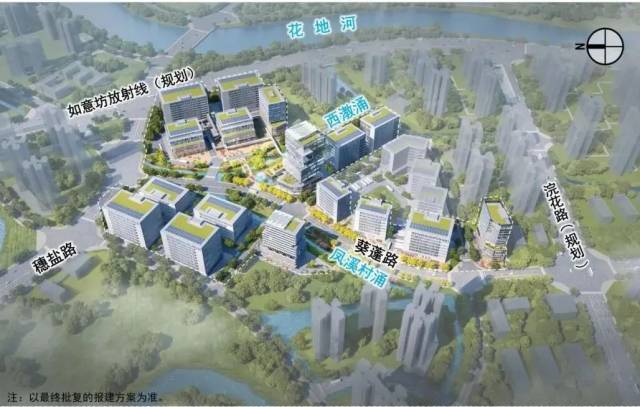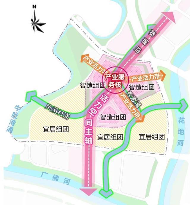 空间方案上沿凤溪村涌、西漖涌两条河涌水系资源打造连续的生态岸线空间,沿河建筑形成前低后高的天际线。