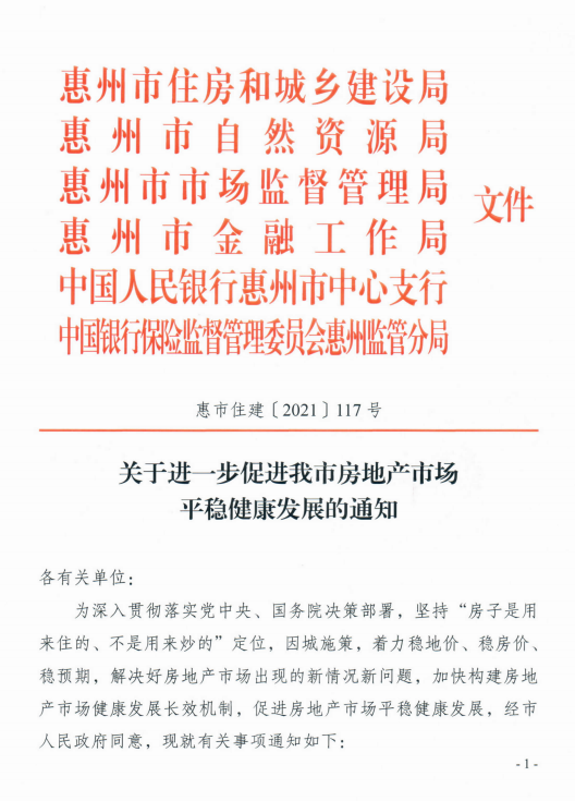 8月9日,惠州市住建局发布《关于进一步促进我市房地产市场平稳健康发展的通知》(下称“通知”),从八个方面加强调控,促进房地产市场平稳健康发展。