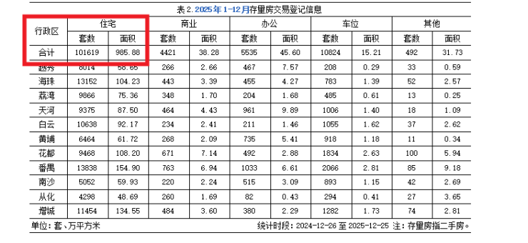 近日,记者从广州市住房和城乡建设局官网看见,2025年广州存量(即二手)住宅交易登记101619套,比2024年的96016套增加5.8%。