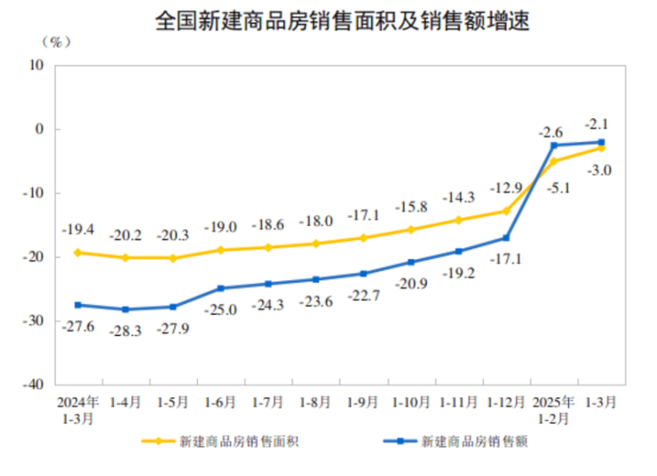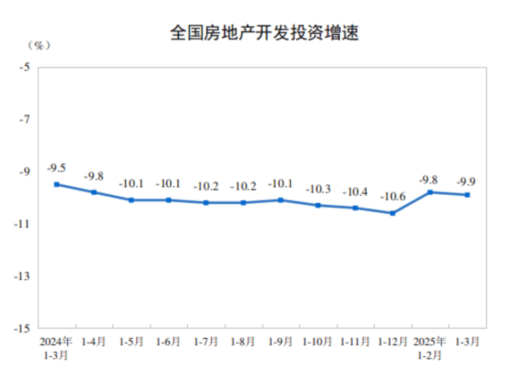 国家统计局公布2025年1-3月房地产开发投资完成情况。一季度全国房地产开发投资约1.99万亿元,同比下降9.9%;新建商品房销售面积约2.19亿平方米,同比下降3.0%,降幅比1-2月份收窄2.1个百分点;新建商品房销售额2.08万亿元,下降2.1%,降幅收窄0.5个百分点。