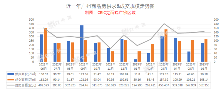 克而瑞数据显示,今年1-6月,广州全市商品房合计供应面积429.57万㎡,同比下降13.8%;成交面积604.58万㎡,同比微增0.8%,成交金额1969.77亿元,同比上涨5.7%。