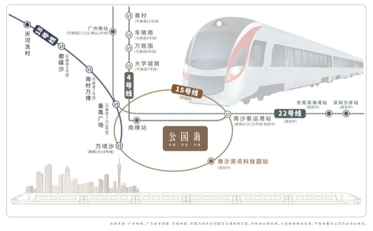 公园海项目距离广州地铁4号线南横站约1KM,迅达番禺、天河商圈;距离15号线南沙资讯科技站(规划中)约500M,步行即达;1站接驳22号线(规划中),2站东莞,3站深圳,30分钟畅行大湾区,与世界无缝对接。