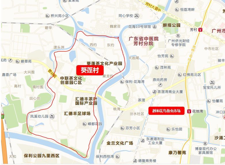 葵蓬村位于花地河畔,毗邻南海,地处广佛交界。周边最近的是花地湾地铁站,距离2.6KM,需要过桥才能到。占地1.75平方公里,旧改面积为半个珠江新城,是中心城区难得一见的巨无霸旧改项目。