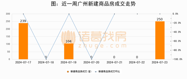 根据广州市住房和城乡建设局数据显示,2024年07月23日广州新建商品房成交250套,较昨日增加250套,环比上涨0%