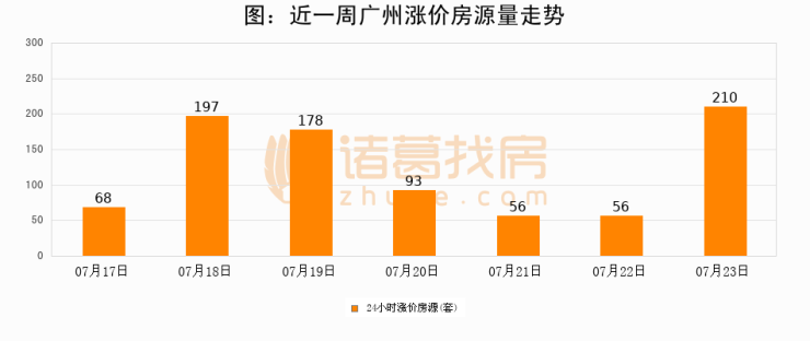 根据诸葛找房数据显示,广州24小时涨价房源量为210套,较07月22日增加154套,环比上涨275%。与此同时,涨价房源占比小幅扩大,业主信心有所提升。