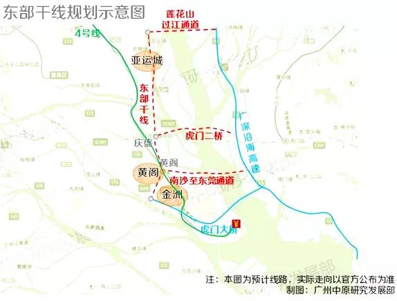 其中,东部干线呈南北走向,北接南大干线(莲花山),预计贯穿番禺石楼、亚运城以及南沙庆盛、黄阁,并与虎门大桥、虎门二桥、南沙至东莞通道、莲花山过江通道接驳。