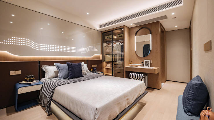 同时空中叠墅以 「尊梯入户」 设计,将归家升华为一幕静谧仪式。电梯门启,区隔喧嚣,赋予每一次往返以深刻的尊崇与安宁。