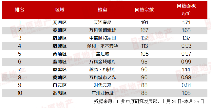 本月目前支撑大市成交的项目以天河壹品、万科城市之光、黄埔新城等中心区优质板块物业为主。