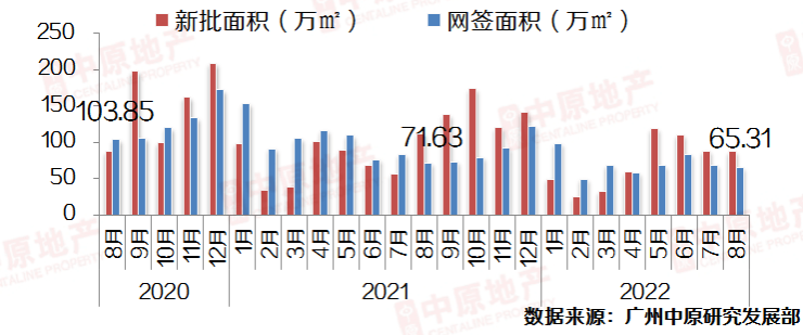 8月,广州住宅新批供应8125套(87.53万㎡),供应面积与7月基本持平,保持年内相对高位,可见目前“去货回款”仍是开发商主调。