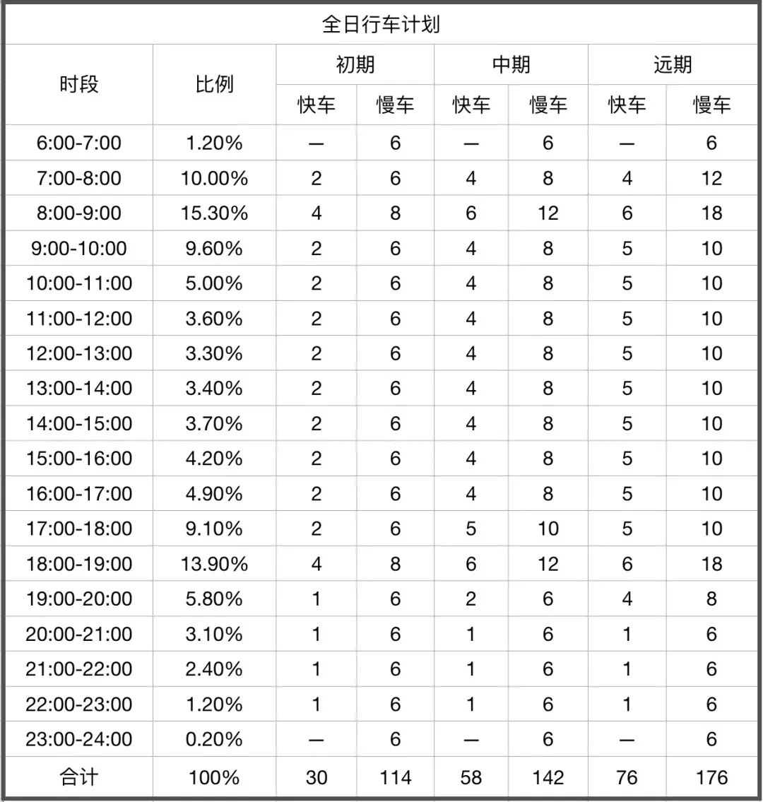21号线运营初期,计划每日发出快车30趟,慢车114趟,合计144趟。见下表: